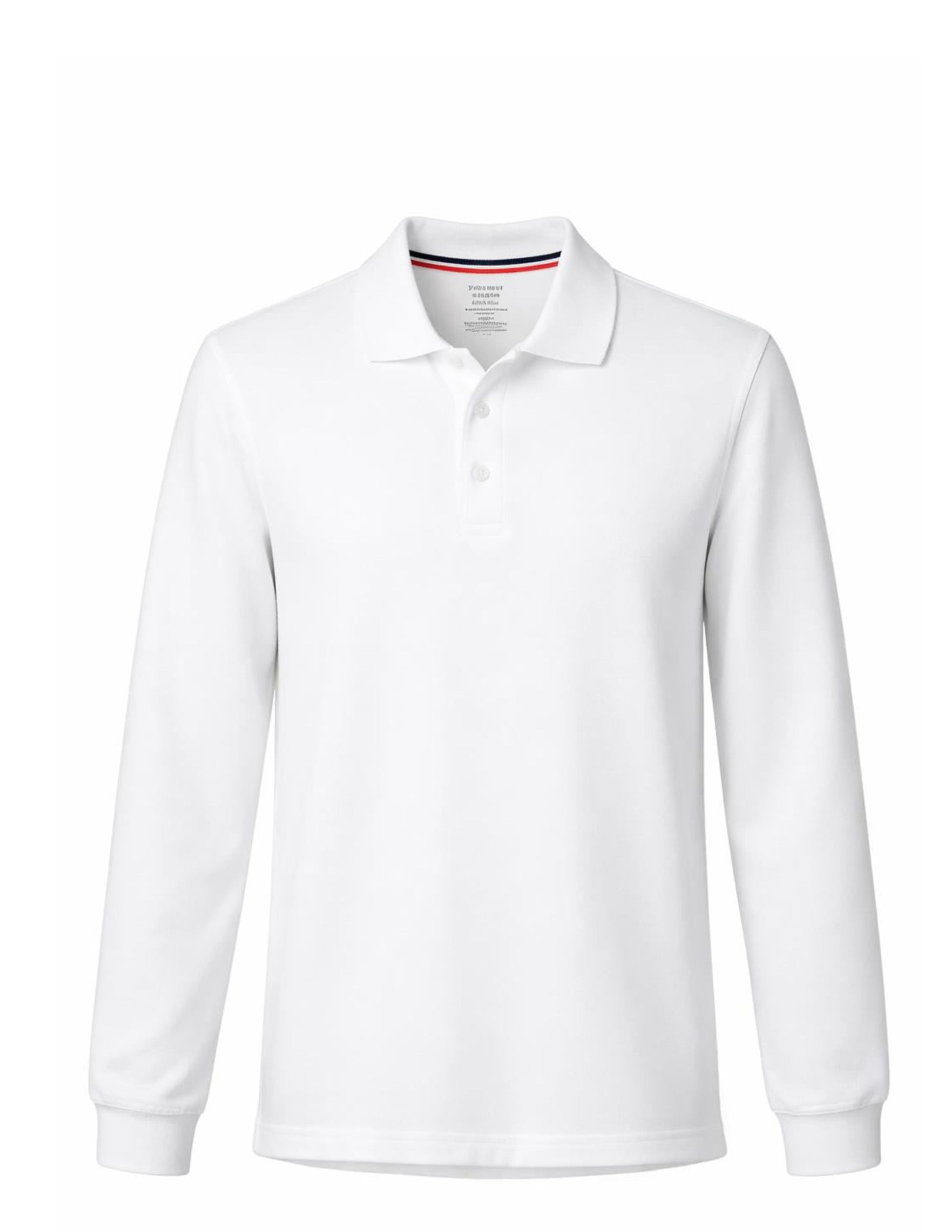A classic long sleeve white polo designed for everyday school wear. This plain style features no logo or embroidery, making it suitable for schools that allow blank uniform shirts. Made from soft, durable fabric for comfort, easy care, and a clean, polished look throughout the school day.
